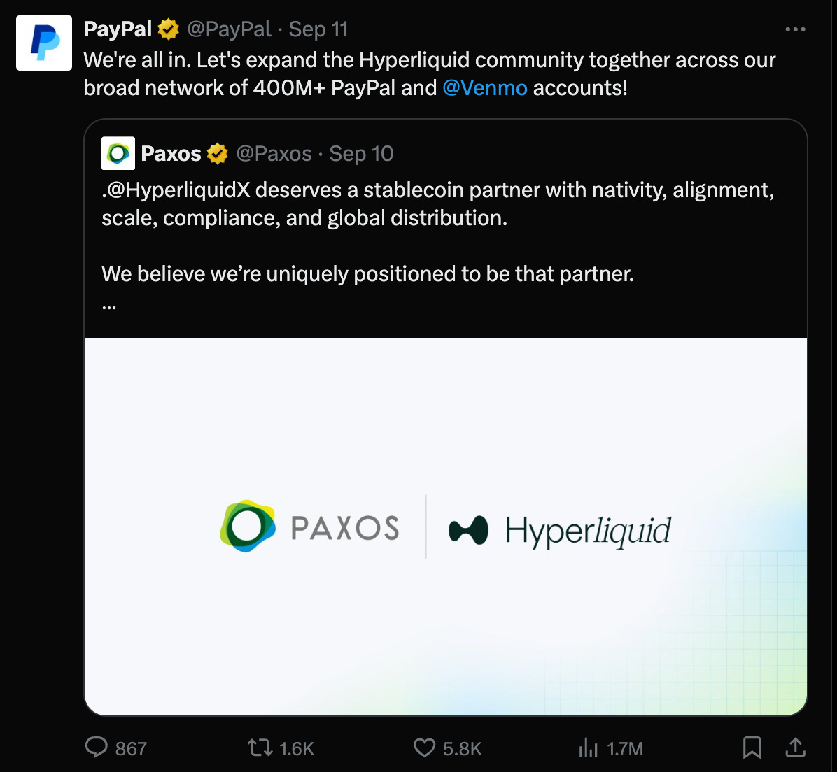 Issuers are tripping over themselves to win. Paxos revised its pitch to pledge 95%+ of reserve yield back to Hyperliquid’s ecosystem and even dangled integrations with PayPal/Venmo. Frax and Sky offered 100% yield sharing, while Agora promised full buybacks and assistance fund contributions. Ethena initially bid but later backed Native Markets, a Hyperliquid-aligned team. The common theme: everyone is groveling because losing USDH means missing a blueprint deal that could reshape how DeFi protocols handle stablecoin revenue.