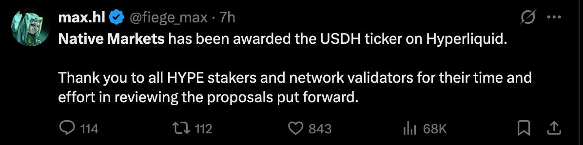 For Circle and Paxos, the stakes are existential. Circle in particular risks watching billions in USDC balances migrate to USDH, cutting off a fat interest stream. They’ve scrambled to announce native USDC on Hyperliquid to stay relevant, but the vibe is clear: Hyperliquid wants less dependence on external issuers and more alignment with its community. As I write this, validator voting has ended, and Native markets has won.
